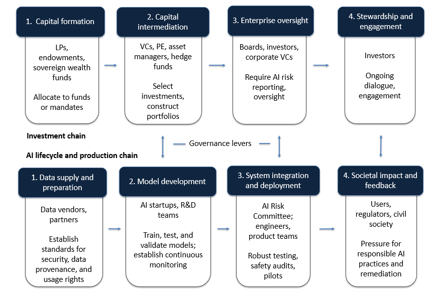 The investment process also catalyzes an AI product chain, which begins with investment and culminates in deployment. The figure below illustrates the investment process and AI product chain unfolding in tandem. It highlights opportunities for investor and board oversight, and includes mechanisms both groups can use to collect information about model behavior and performance over time.